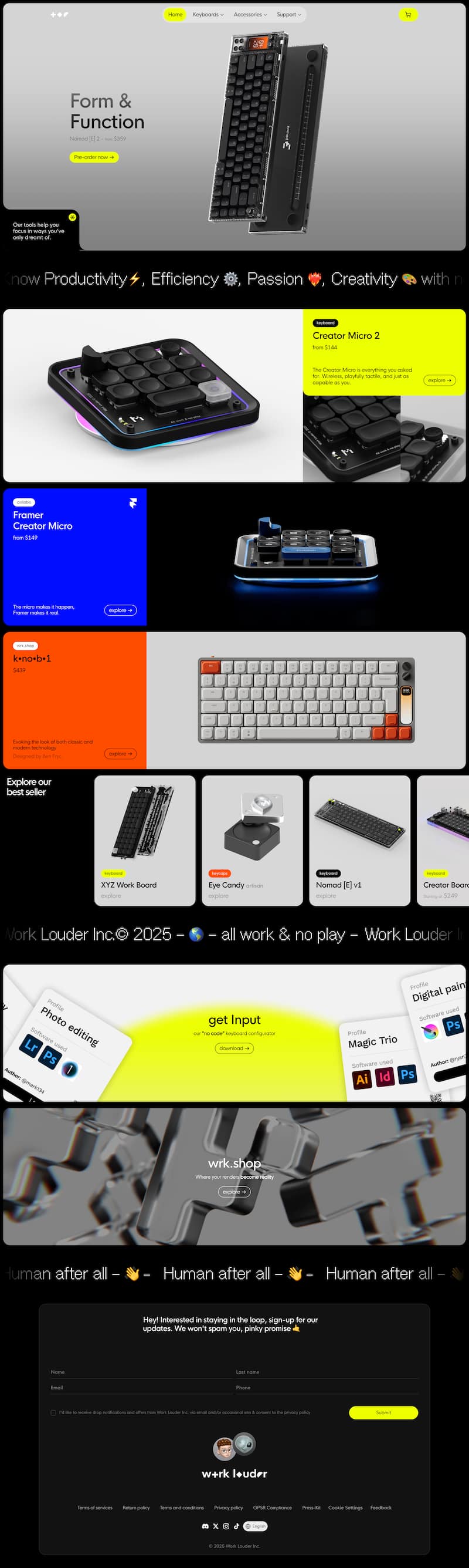 价值:Work Louder电商独立站提供的是科技硬件,主要做生产力与创意工作相关的电脑外设,尤其是机械键盘、模块化输入设备、如快捷键板、键帽等,针对设计师、内容创作者、程序员这类键盘重型用户。